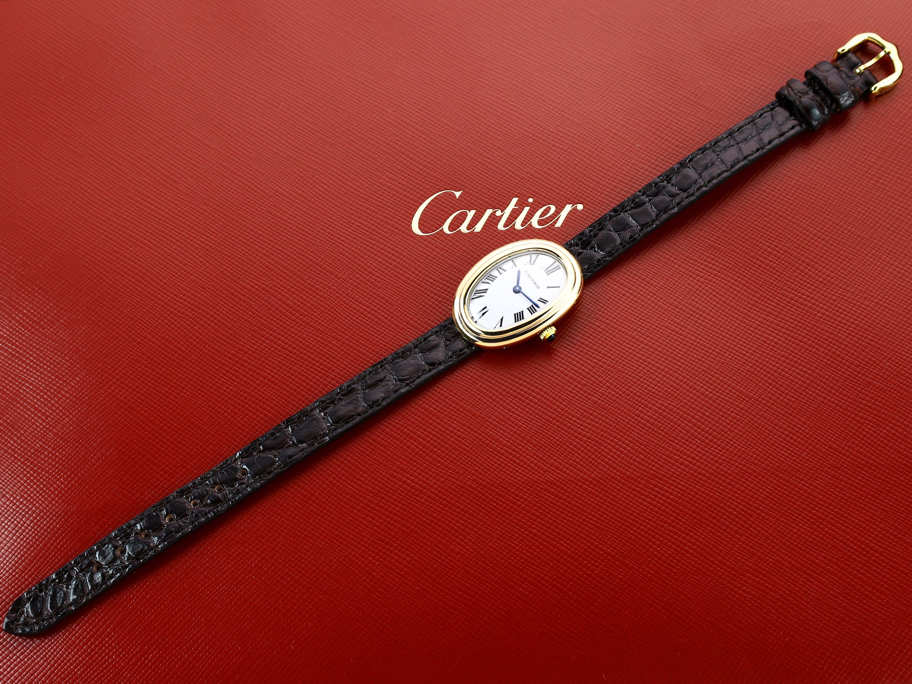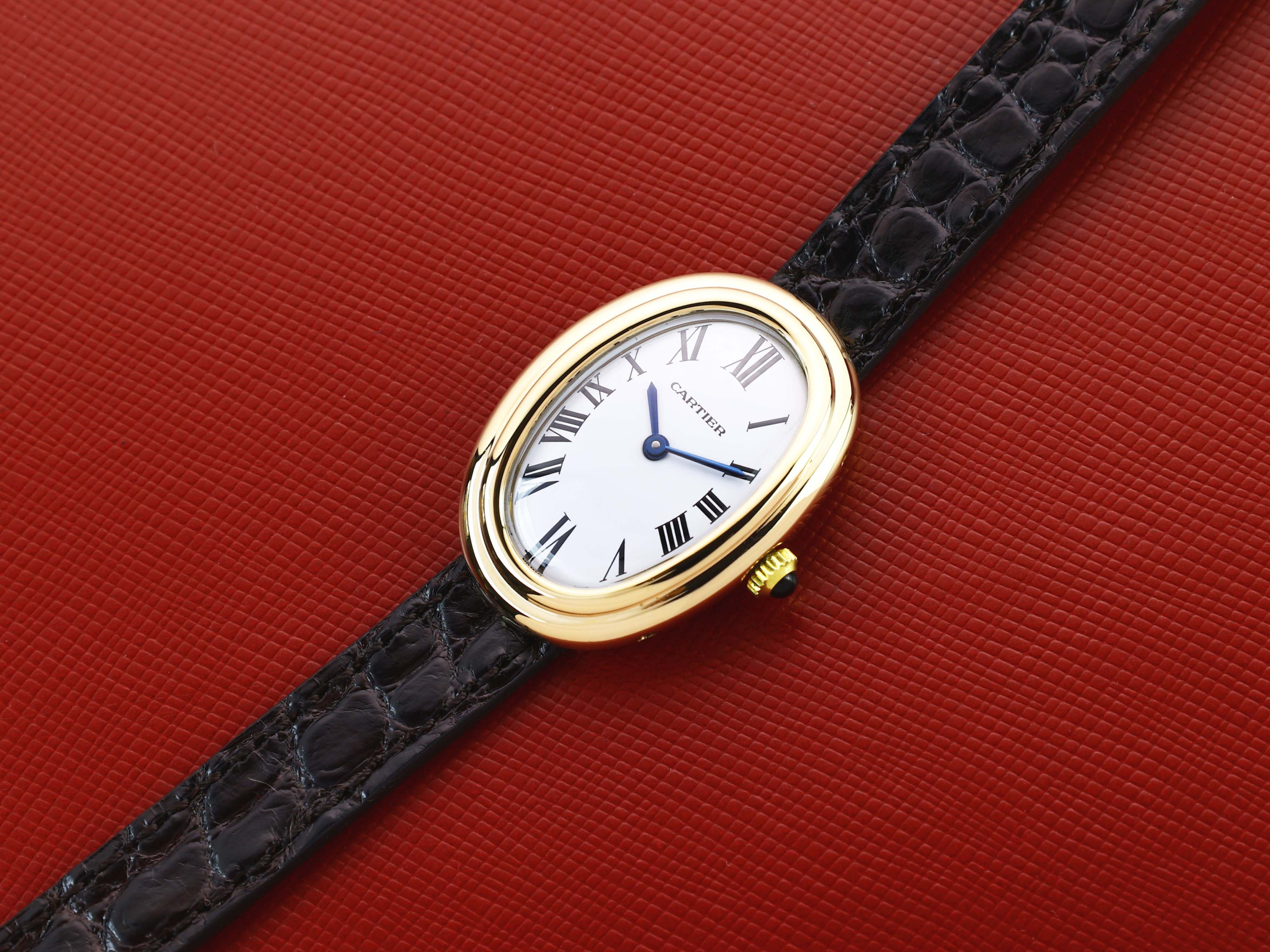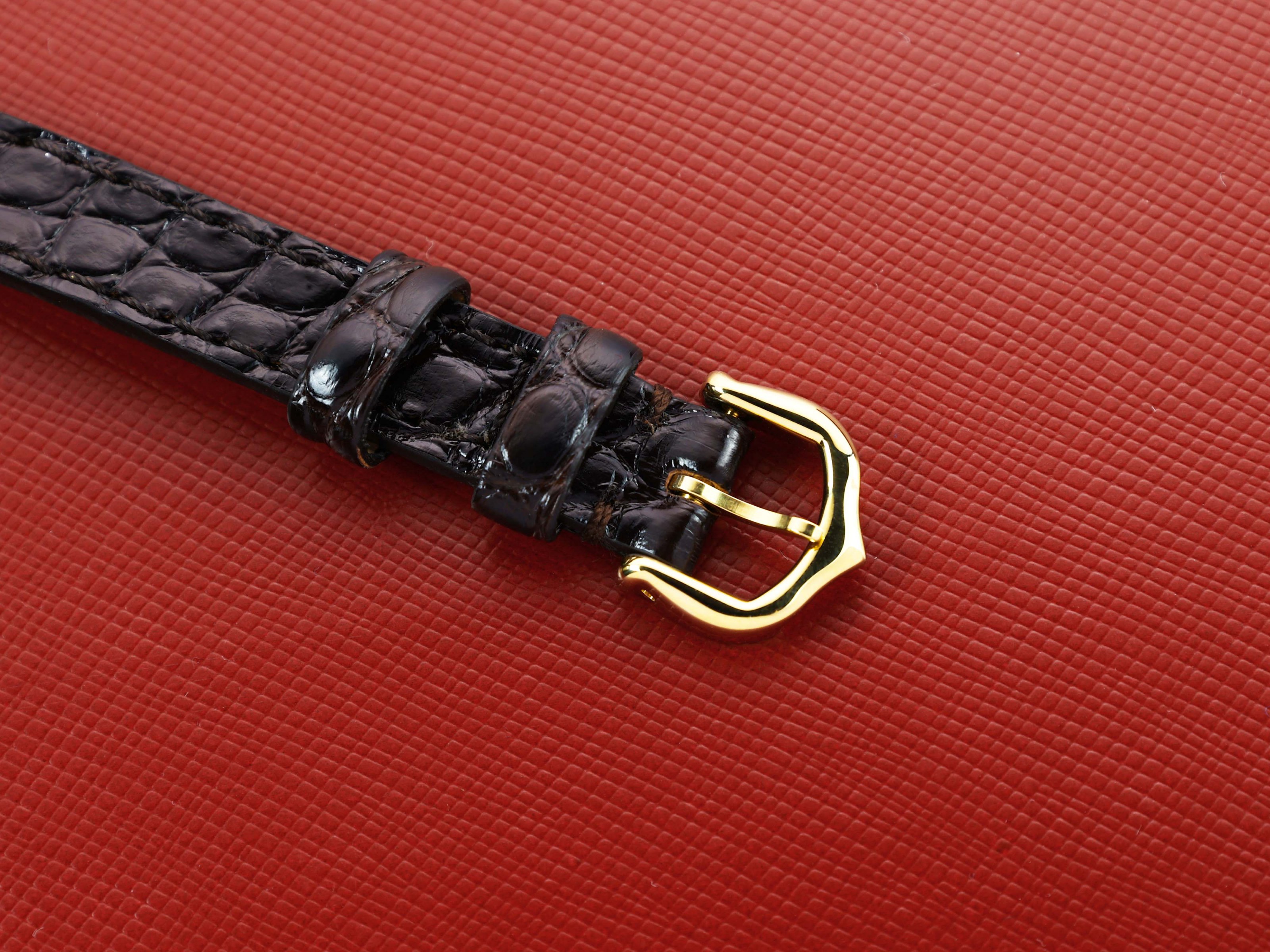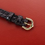 Dieses Exemplar befindet sich in einem sehr schönen, original erhaltenen Zustand. Im Inneren arbeitet ein zuverlässiges Handaufzugswerk, während die typische Cartier-Krone mit tiefblauem Cabochon einen zusätzlichen Hauch von Raffinesse verleiht. Komplettiert wird die Uhr durch ein extralanges, dunkelbraunes Lederarmband in edler Kroko-Optik, das den warmen, eleganten Charakter der Baignoire perfekt abrundet.