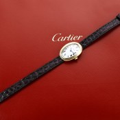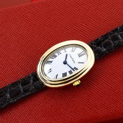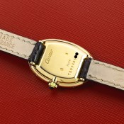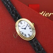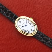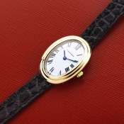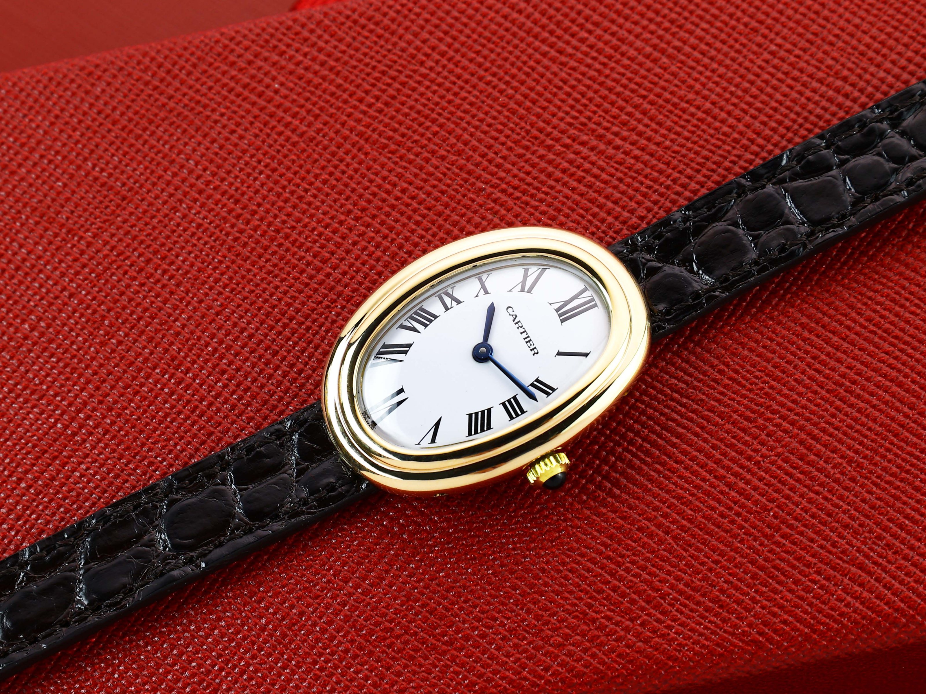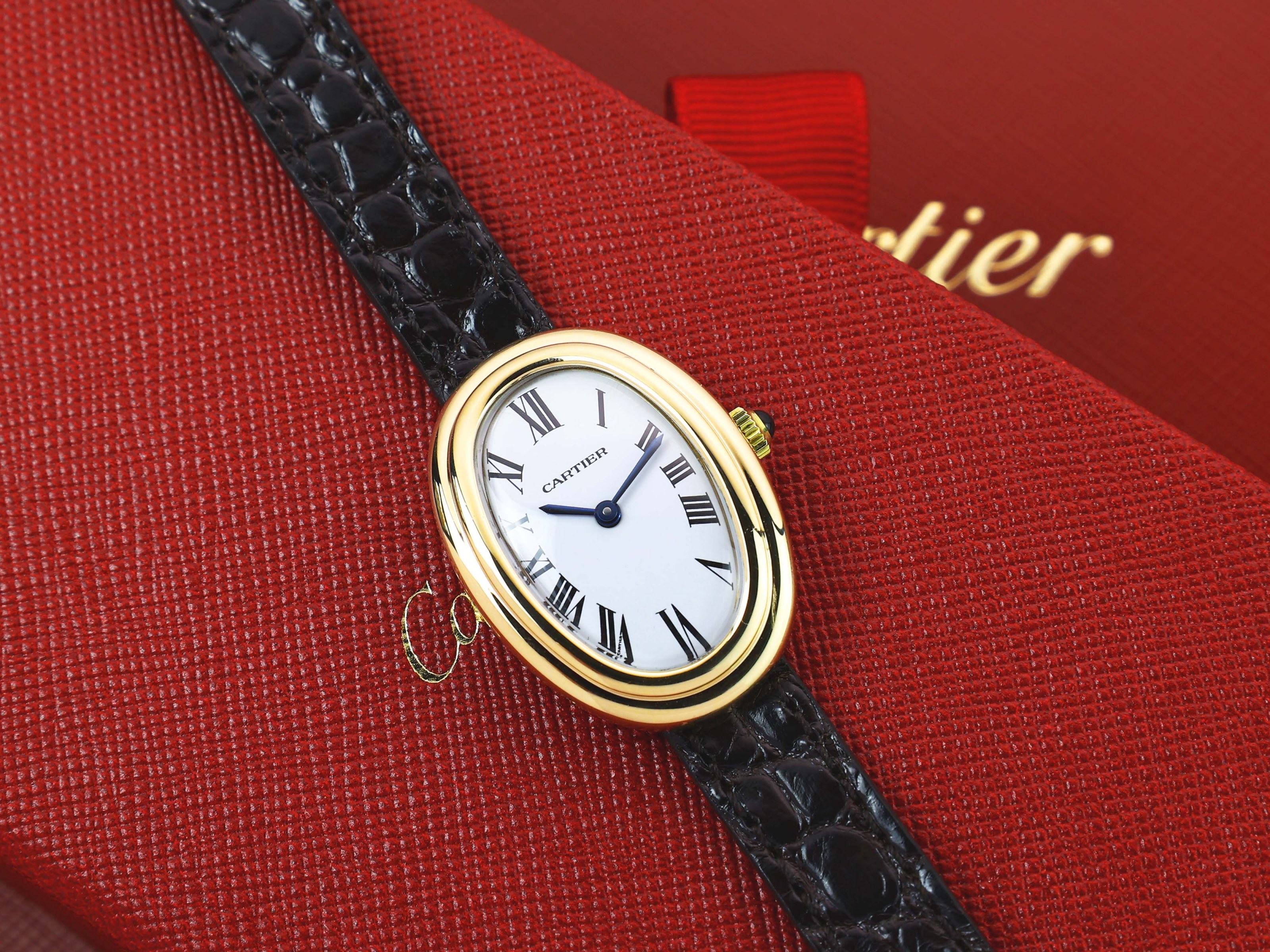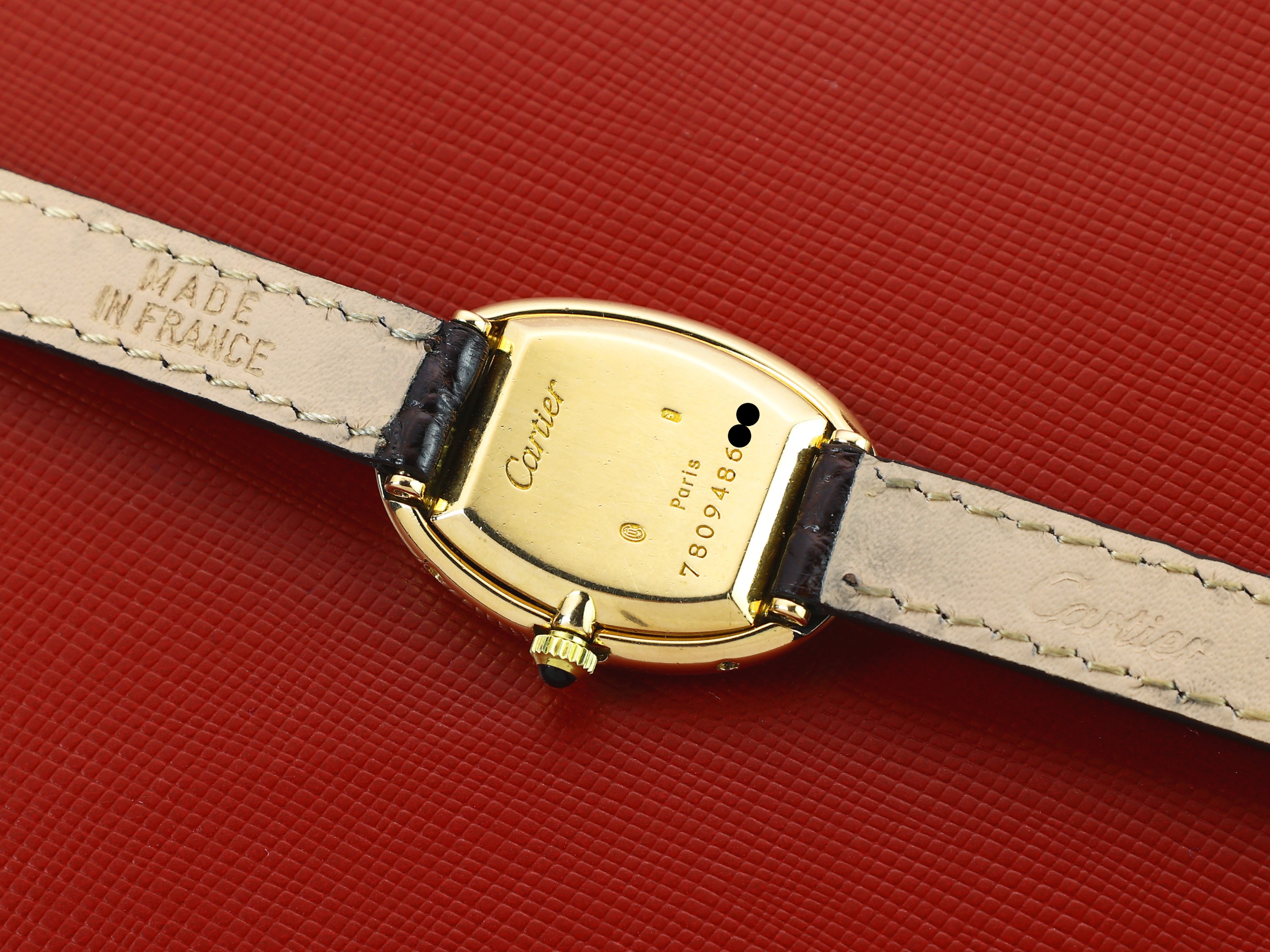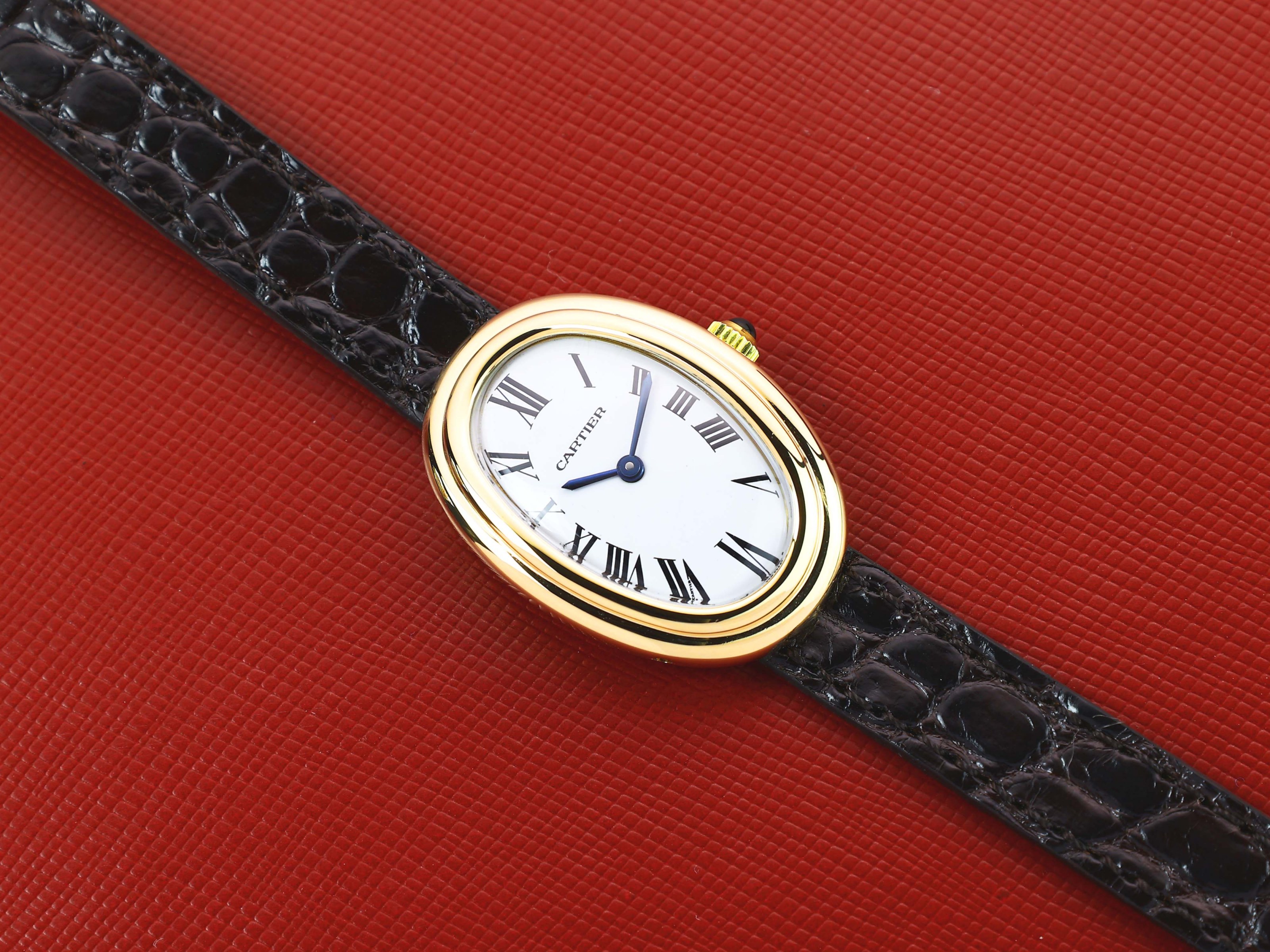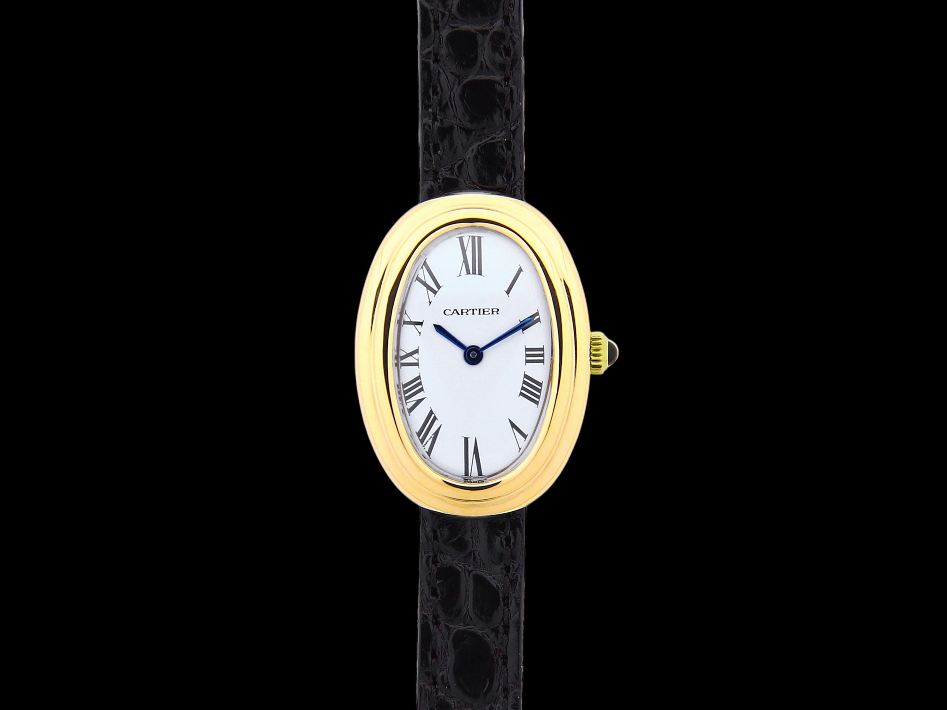 Bemerkungen: Die Cartier Baignoire Ref. 78094 zeigt sich in ihrer ganzen zeitlosen Eleganz: das charakteristische, sanft geschwungene Ovangehäuse aus 18 Karat Gelbgold umrahmt ein klassisches weißes Zifferblatt mit römischen Ziffern - ein Design, das seit den 1910er-Jahren für Cartiers besondere Formsprache steht.