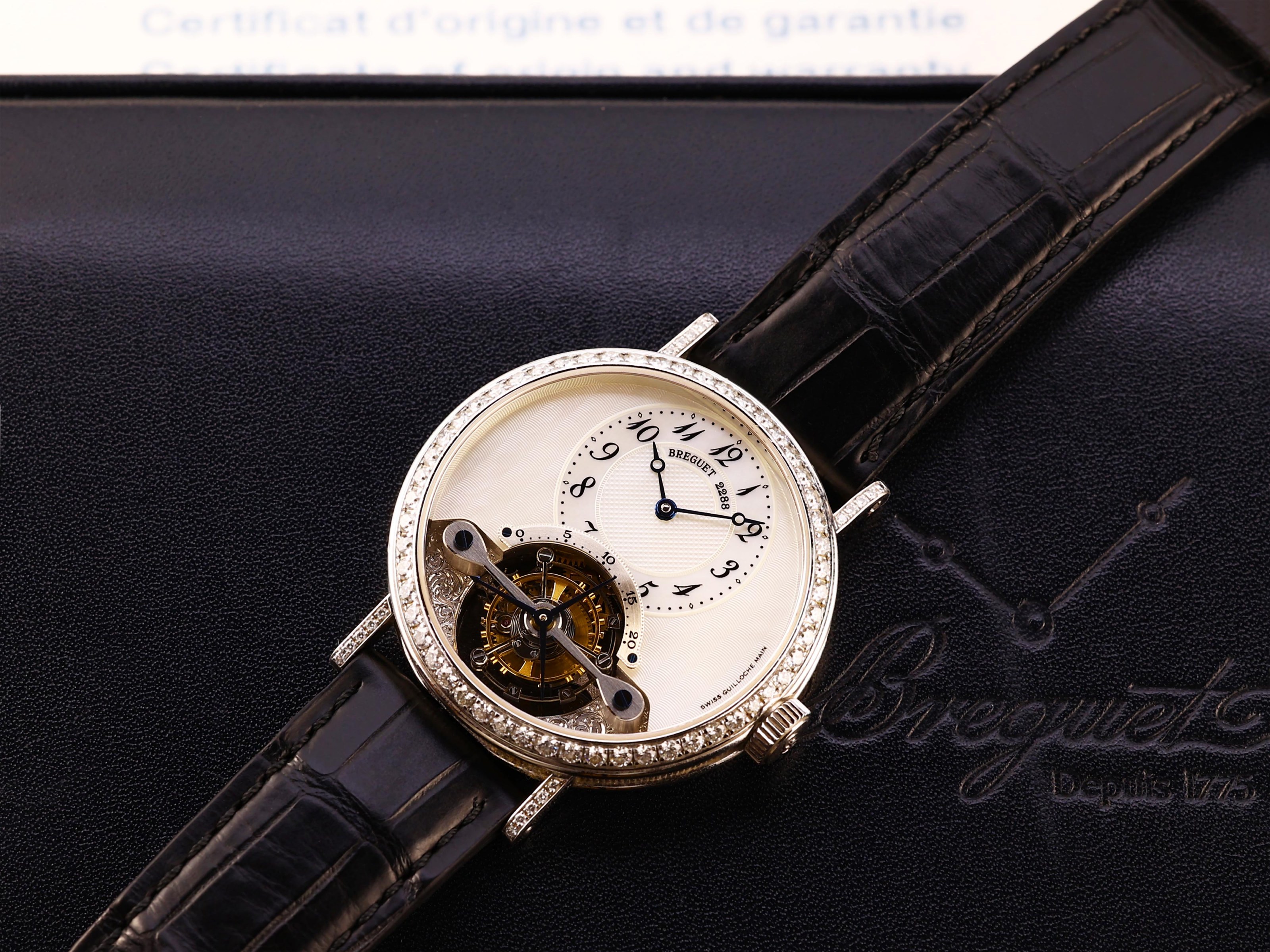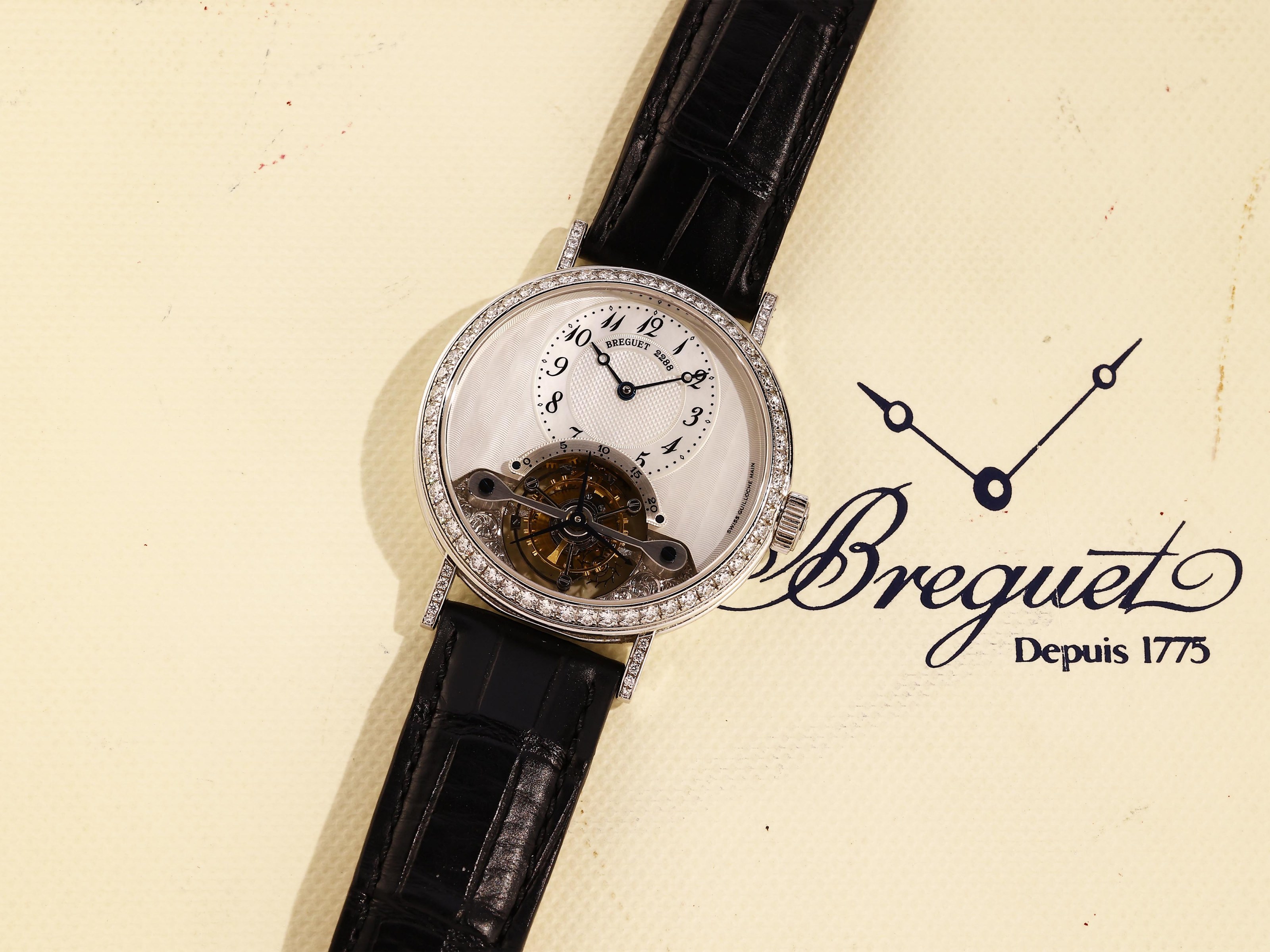 Das 36 mm große Gehäuse besteht aus Weißgold und ist ab Werk vollständig mit Brillanten besetzt. Auch die originale Dornschließe ist mit Diamanten gefasst, was bei Breguet nur bei wenigen Referenzen zu finden ist. Trotz der Steinbesetzung bleibt die Gestaltung typisch Breguet: feine Proportionen, schlanke Hörner und eine sehr ausgewogene Präsenz am Handgelenk.