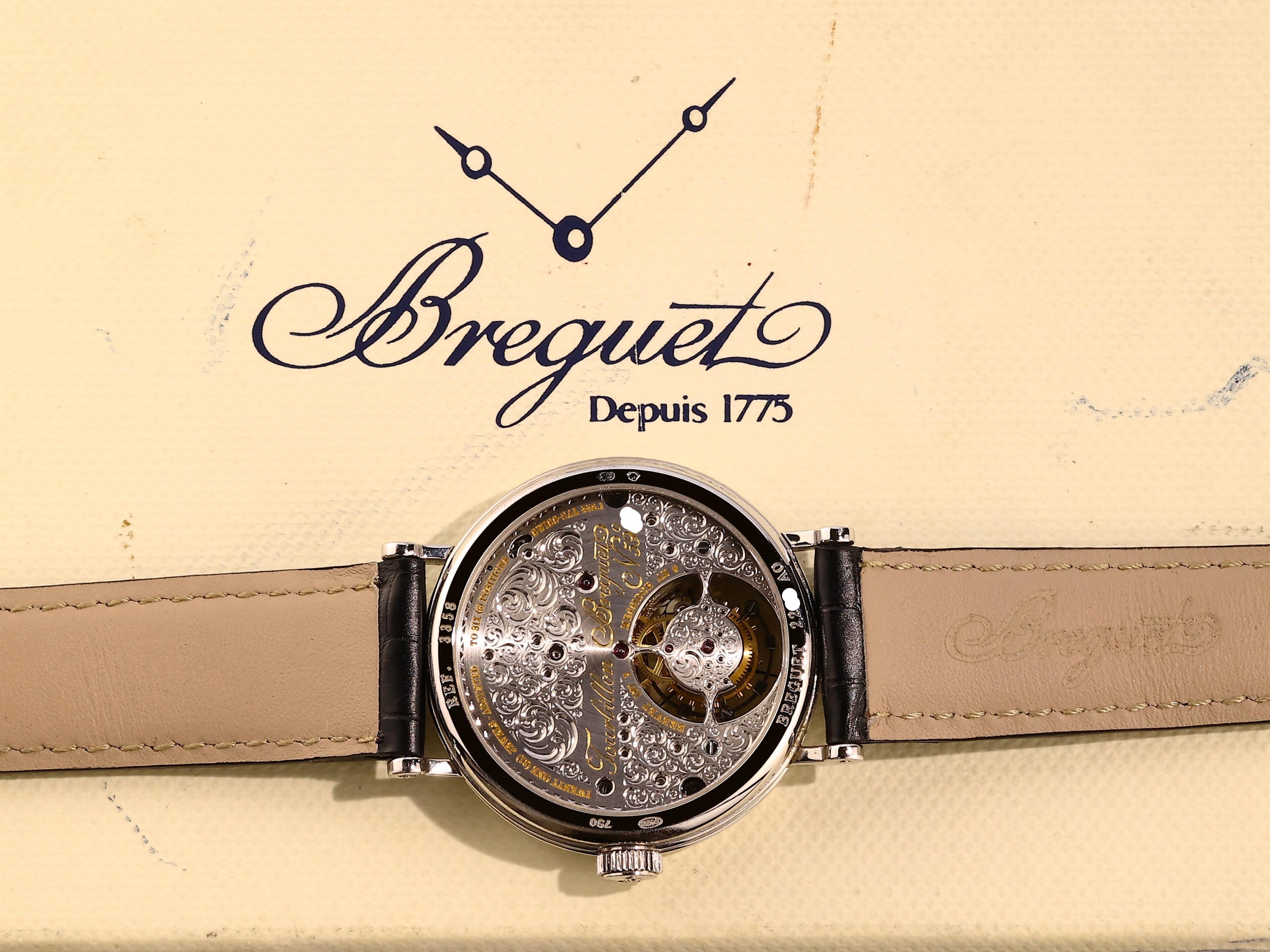 Die Uhr hat einen Durchmesser von 36 mm und kommt vollständig mit Box und Papieren. Insgesamt handelt es sich um ein sehr seltenes und technisch wie gestalterisch außergewöhnliches Modell innerhalb der Breguet-Kollektion.