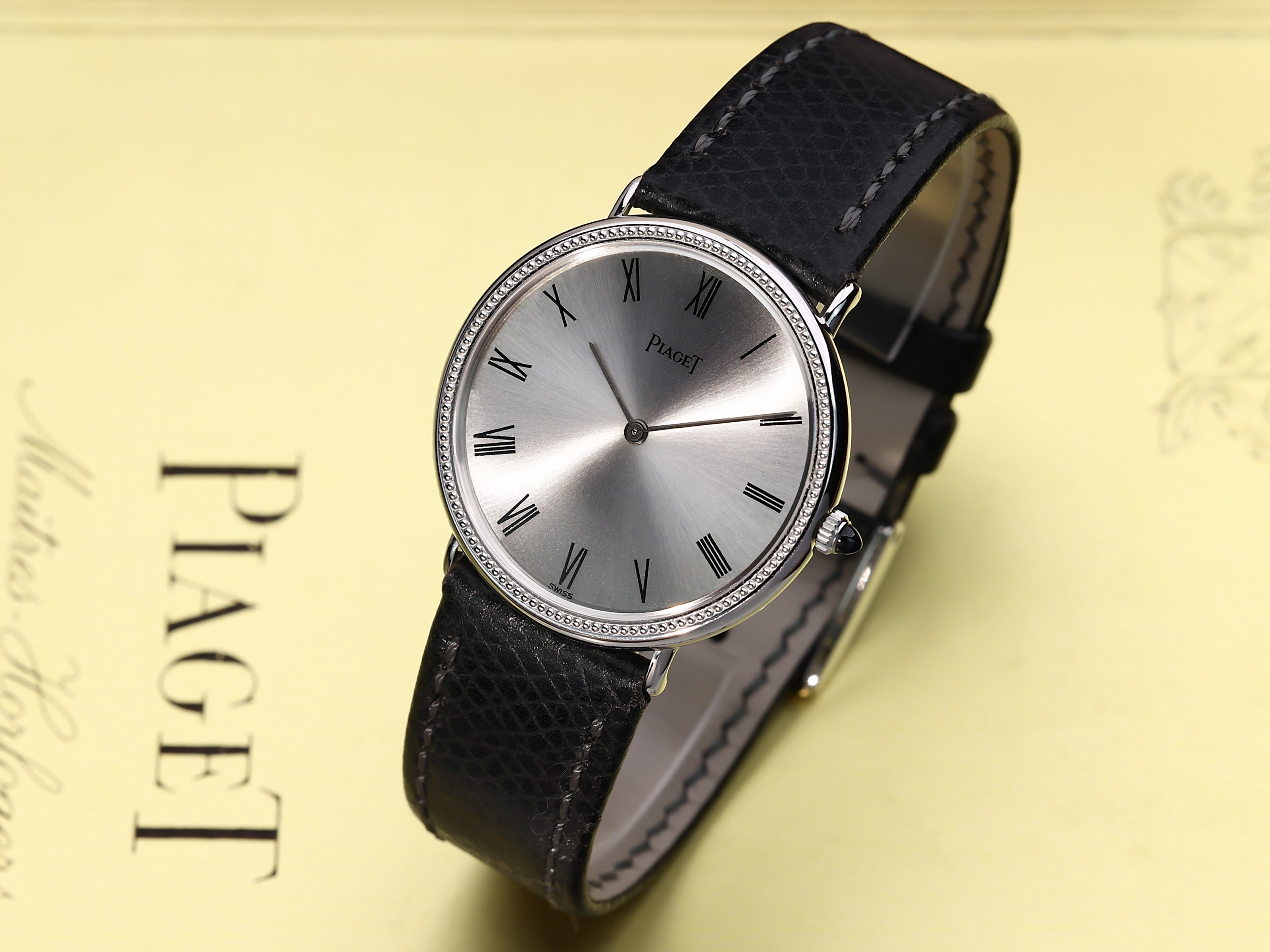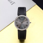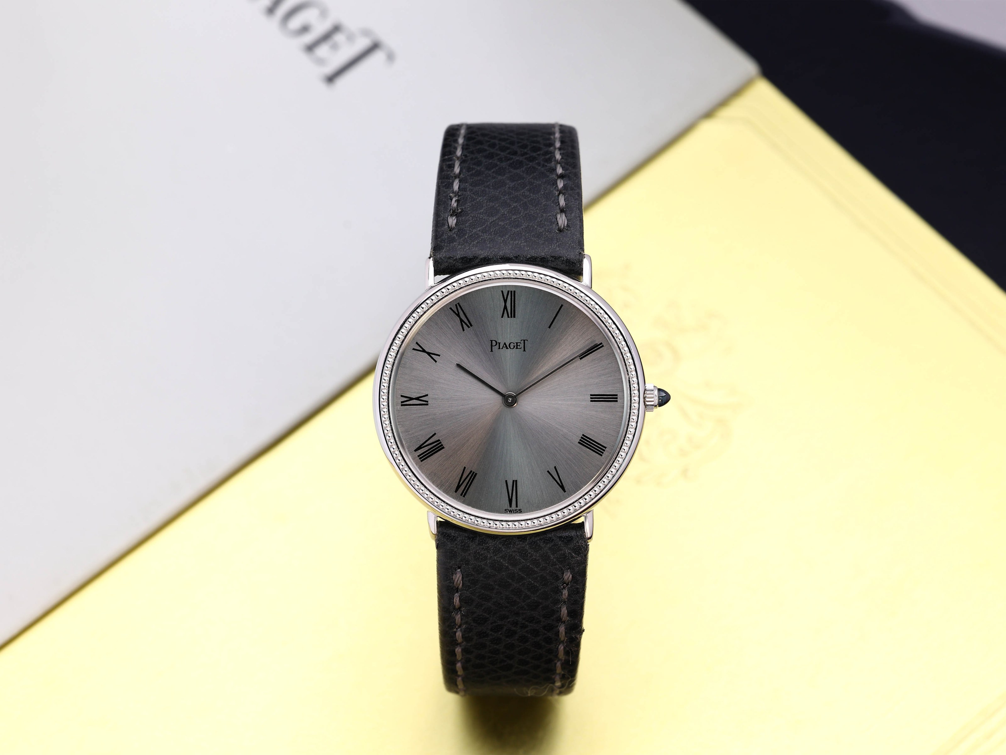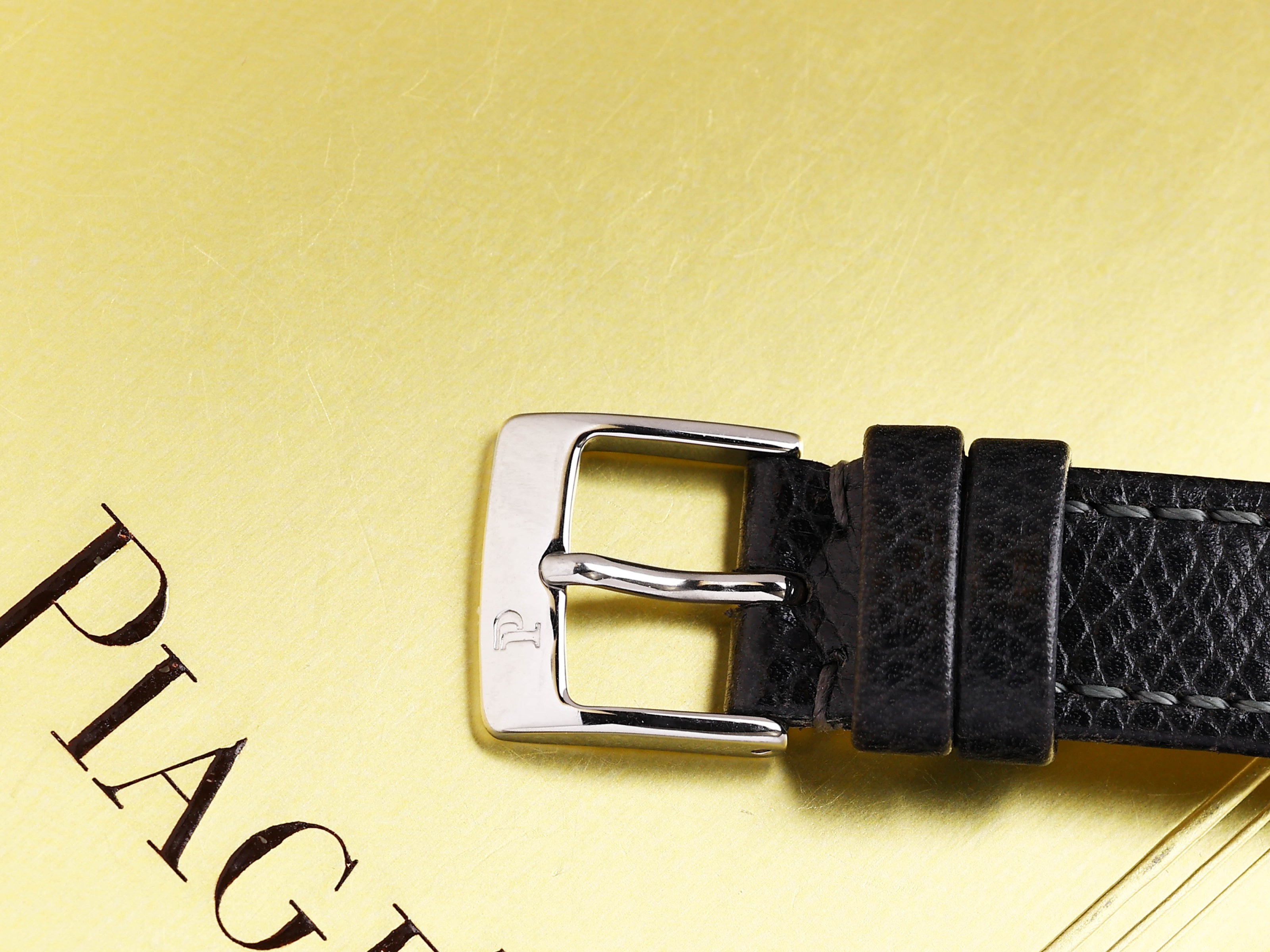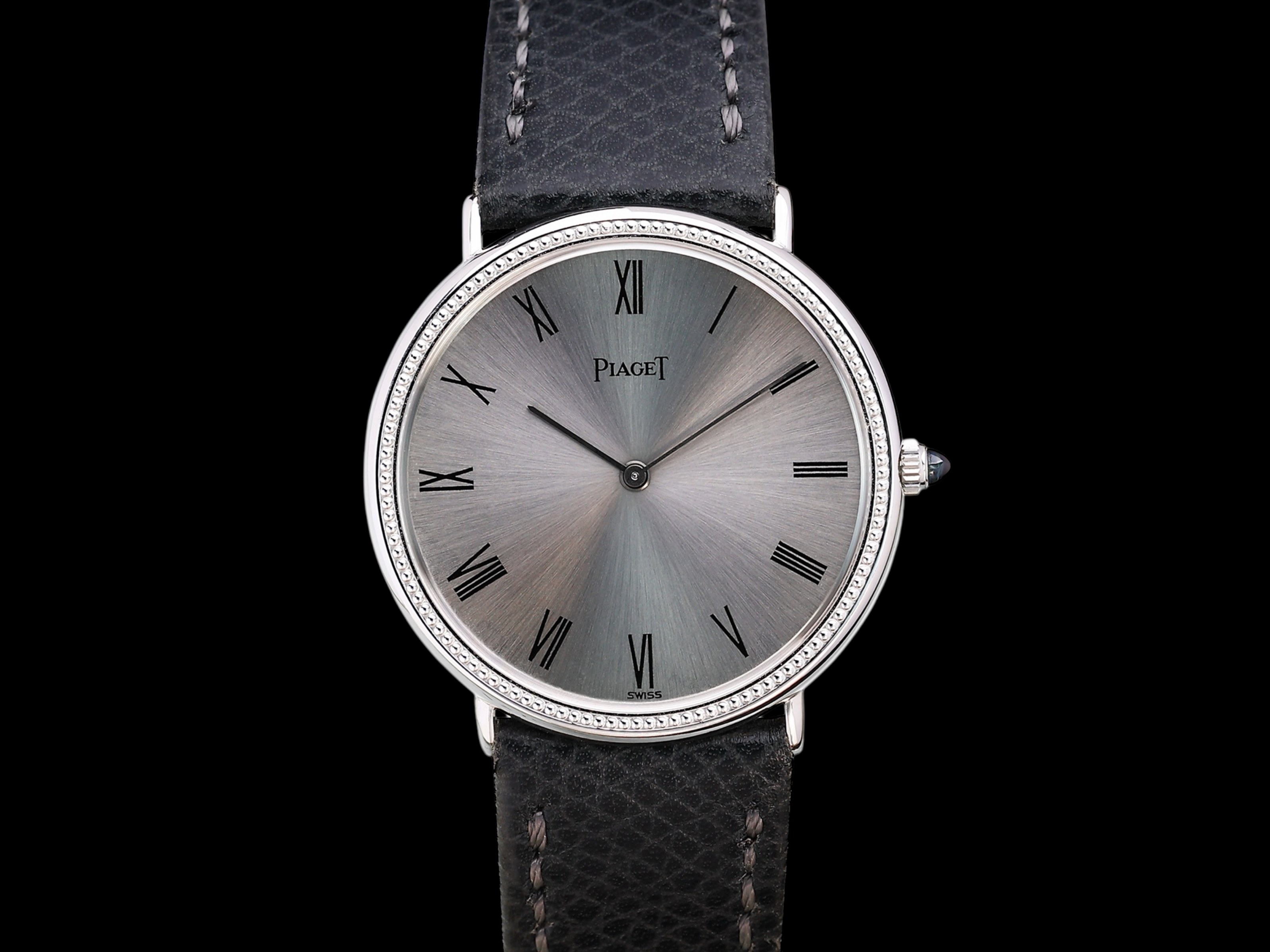 The anthracite sunburst dial with Roman numerals complements the understated elegance of the watch. It comes on its original Piaget leather strap with Piaget steel pin buckle. A remarkably preserved dress watch from Piaget’s golden era.