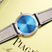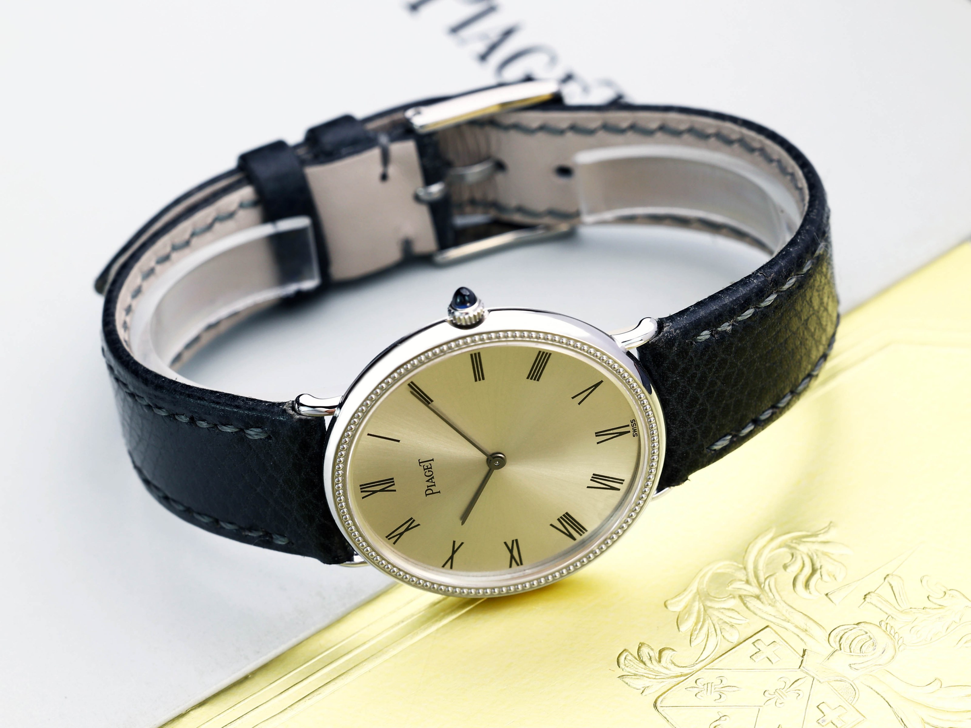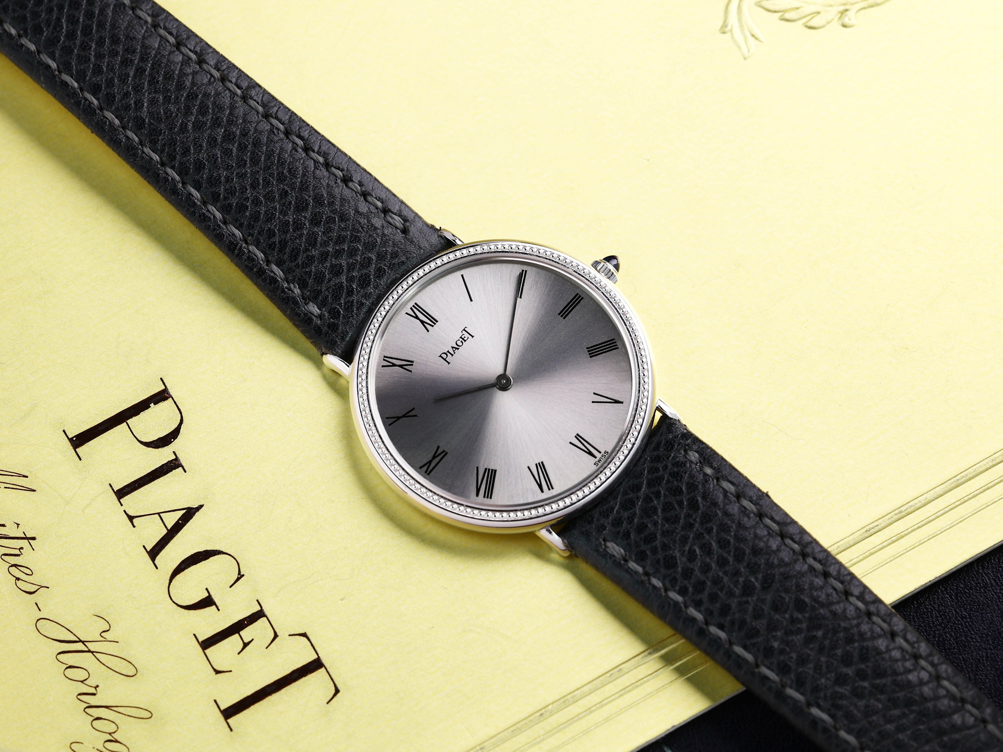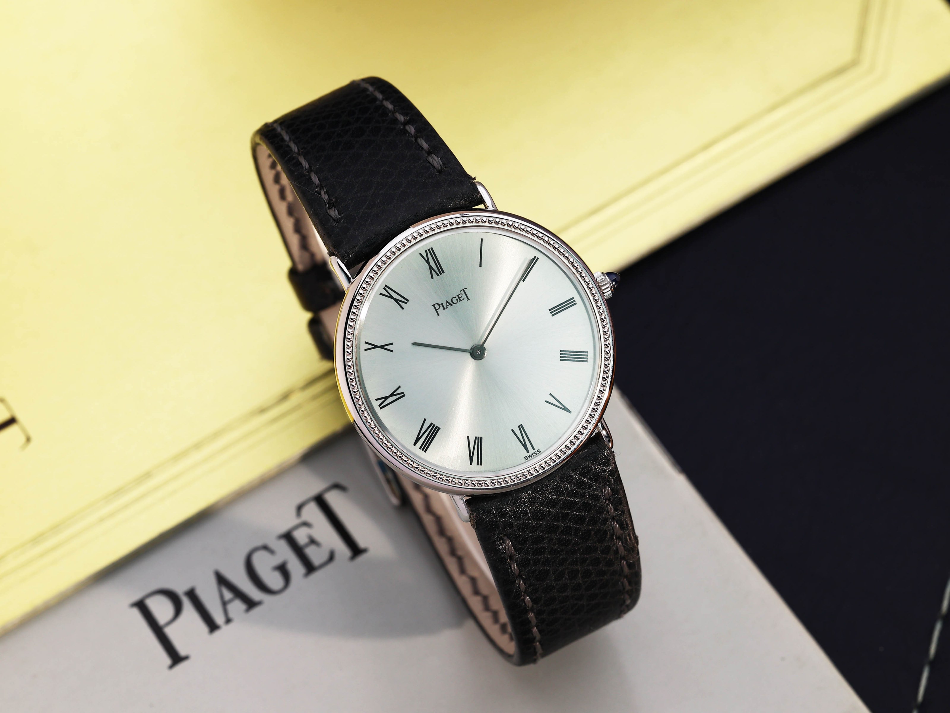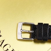 The anthracite sunburst dial with Roman numerals complements the understated elegance of the watch. It comes on its original Piaget leather strap with Piaget steel pin buckle. A remarkably preserved dress watch from Piaget’s golden era.